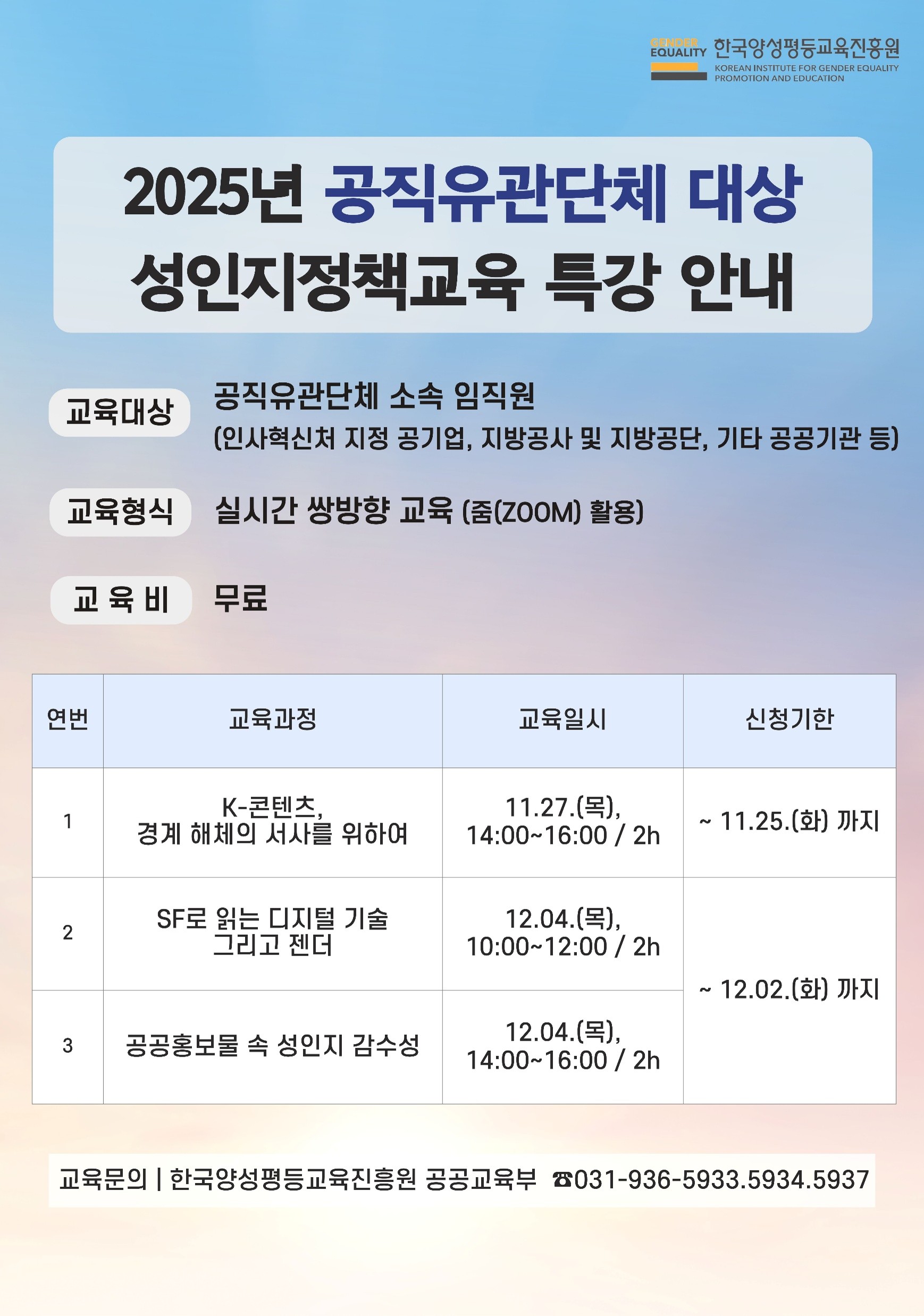 - 성희롱·성폭력 예방 통합교육(1, 2): 성희롱 개념의 이해, 성희롱 사례 및 2차 피해, 성희롱 대응, 성희롱·성폭력 예방을 위한 양성평등한 조직문화의 조성, 성폭력의 이해, 디지털 성폭력의 이해, 성폭력의 대응, 디지털 성폭력 해외 대응 사례