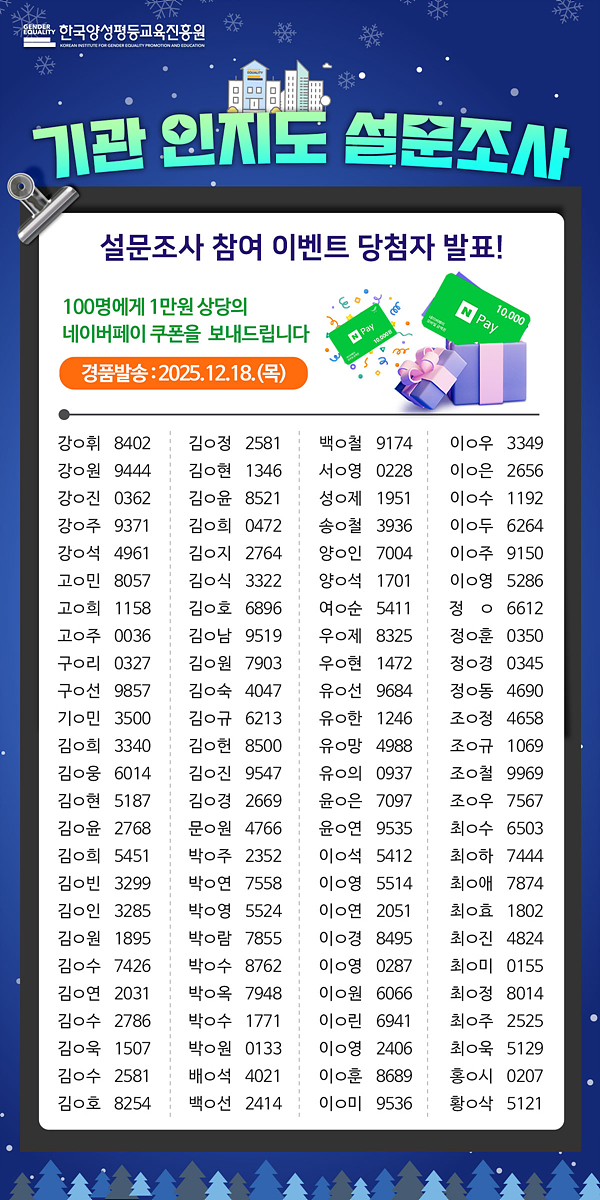 <2025 한국양성평등교육진흥원 기관 인지도 설문조사(12.8~12.14)> 이벤트에 참여해주신 모든 분들께 감사드립니다.